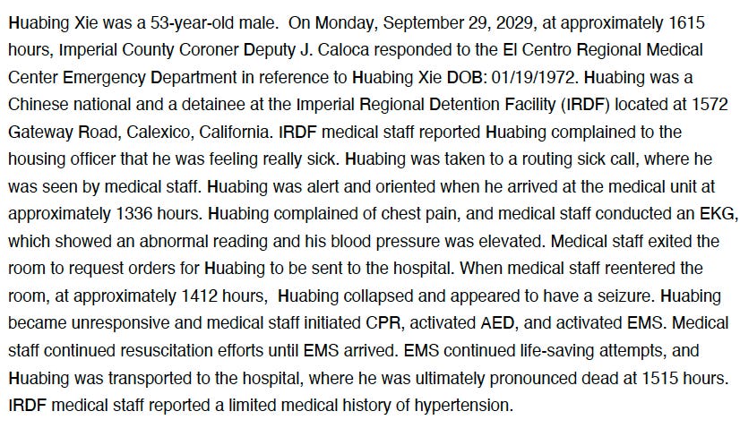 In September, a Chinese man experiencing seizures and heart issues was left unattended by medical staff at a facility in California, according to an autopsy report provided to American Doom by authorities. Huabing Xie later died of a heart attack after being left alone for 36 minutes during a crucial window of time, the autopsy showed.