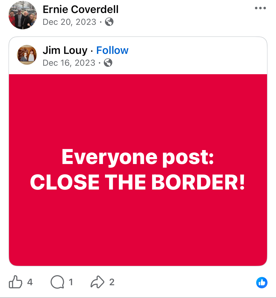 “CLOSE THE BORDER,” read a post shared in 2023 by Coverdell.