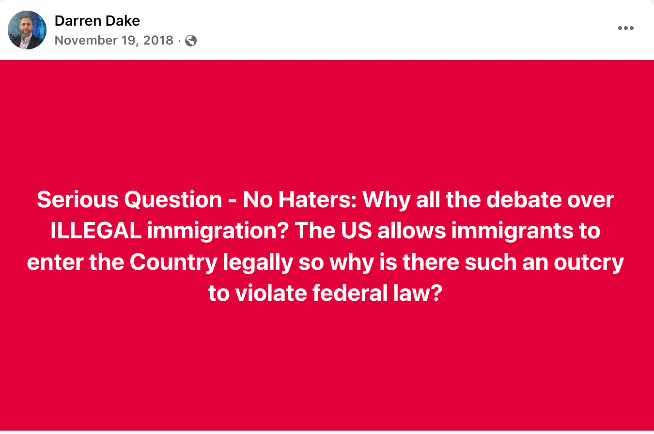 Dake has shared posts that support Trump’s “remain in Mexico” asylum policy and decried “leftists” who “hate border walls and gun rights,” among other pro-Trump posts.