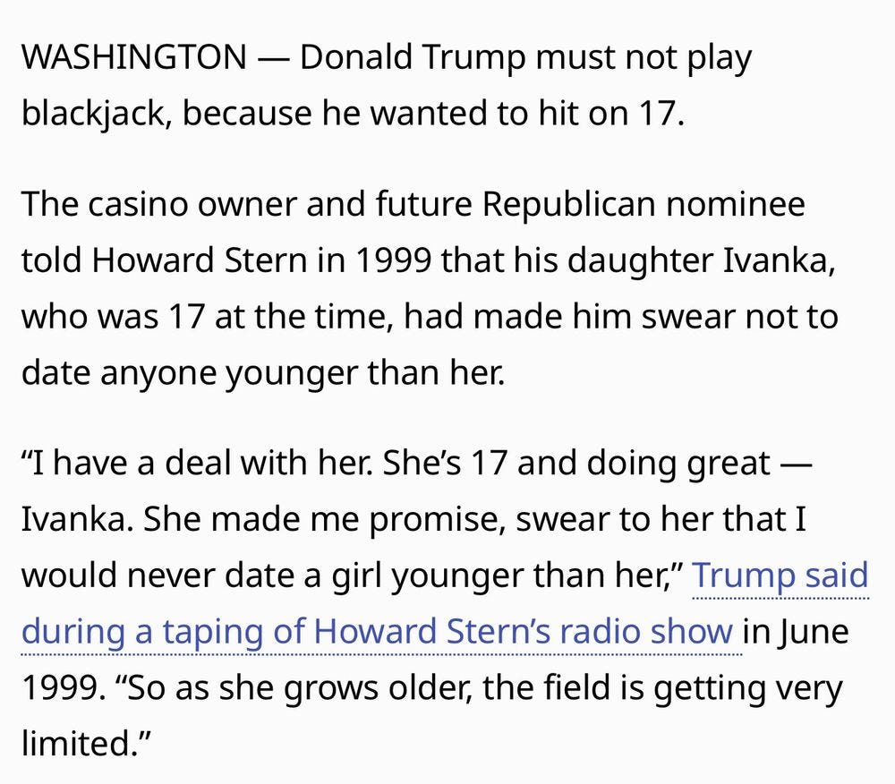There’s quite a bit of evidence that Trump is not just a sex predator but has an affinity for younger women — even children around the age of his daughter, Ivanka, when she was 17. Then there’s all his ties to Epstein and their partying together with women half their age.